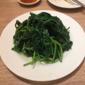 大きめのお皿に山盛りで出てきます。見た目は青菜の炒め物といった感じ。きれいな緑色でとても良い具合に炒められています。ニンニクかなりたっぷり。