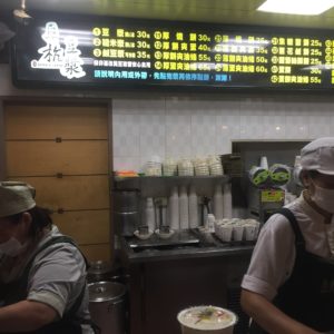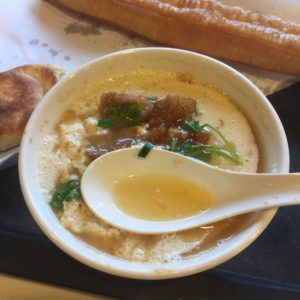 豆乳は甘い味付けのものと塩味のついたもの(鹹豆漿)があり、どちらも冷たいものと温かいものがあります。今回は温かい鹹豆漿を注文。