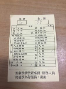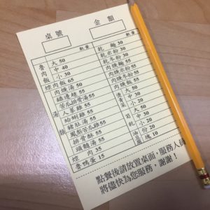 台湾のご飯やさんの多くは、紙に注文を書いて渡すというスタイル。ここもそうで、席に着くと紙とエンピツが置いてあるので個数を書いて渡します。