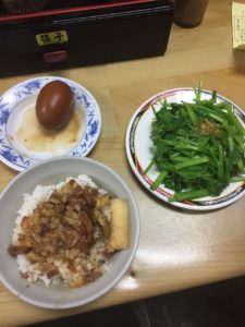 今回は魯肉飯の小2つ、卵1つ、青菜炒めの小を注文しました。全てで95台湾ドル。安い!