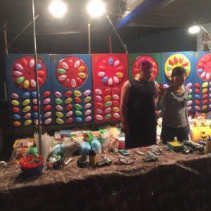 射的のお店はかなりの数がありました。射的と言ってもお店によって方法はさまざまで、ふうせんを割ったり、ボールを投げたりいろいろ。見た感じもレトロで見ているのは楽しかった。というか日本のお祭りでもあんまり見かけなくなったので新鮮でしたね。